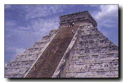 Hacia el centro de la gran explanada se encuentra la pirámide de Kukulkán o "Castillo" el cual orientado astronómicamente nos